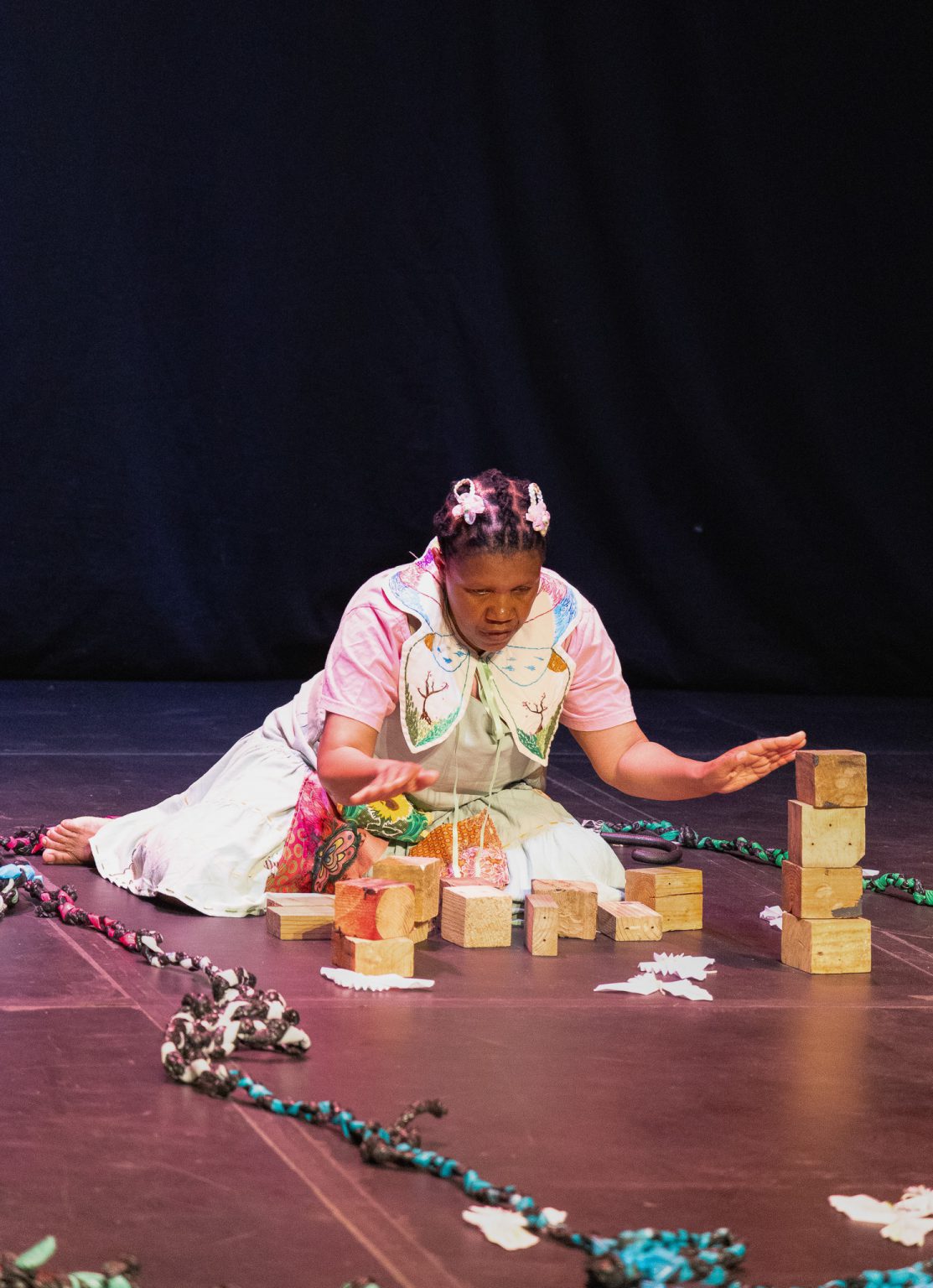 The stage is littered with multicoloured butterflies, dressed in what I recognise as ugqabsi [skipping rope]. In comes Neo dressed in a light blue knee-length dress stitched with butterflies on the pockets, she catches a butterfly and watches it as it soft-lands on her arm.