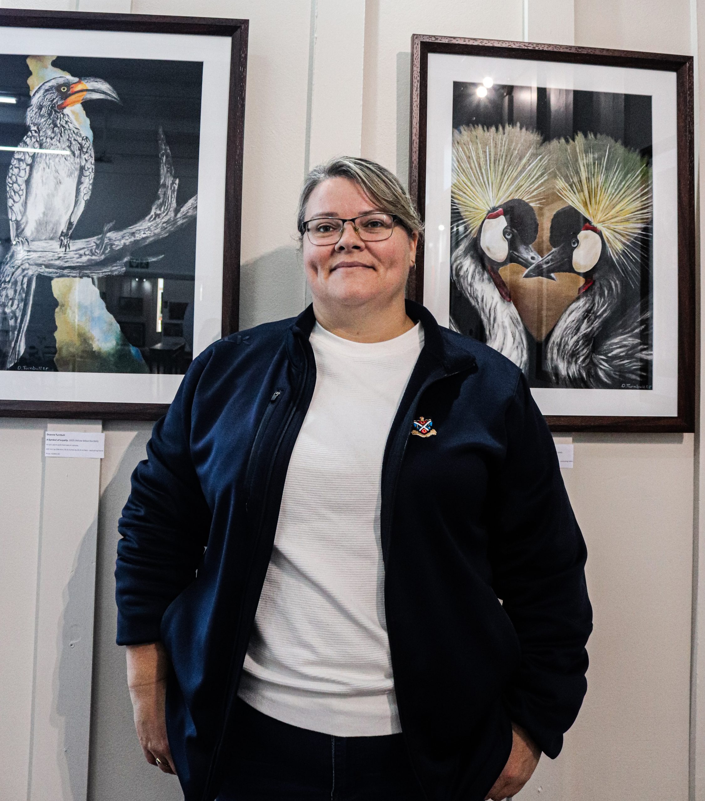 Deanne Turnbull renders the vibrant world of birds with remarkable contrast and precision using charcoal and acrylic. “Owls, in particular, have become a recurring theme in my work,” she said, drawn to their mystery and vivid presence. Originally from Johannesburg, she is now a painting and drawing teacher in Makhanda. Turnbull’s background in mural painting and visual arts education is evident in her expressive technique.
